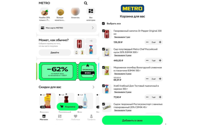 «Предсобранная корзина — важный шаг в персонализации, который экономит самое ценное — время пользователя. В среднем, она помогает сократить сбор продуктов с 15-20 минут — до одной», — комментирует Николай Бруяка, директор по развитию E-grocery & Non-food сервиса доставки «Купер».
